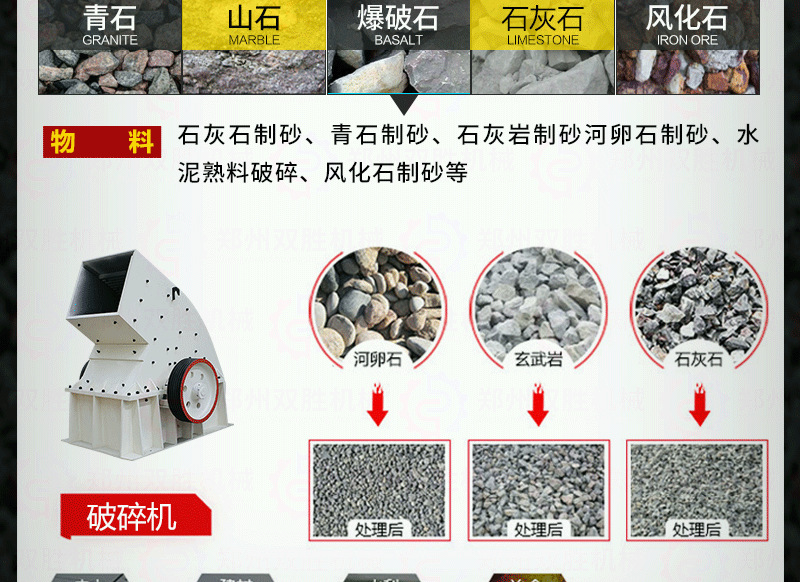 錘式制砂機(jī)的進(jìn)料口和破碎腔很大,適宜于大塊物料破碎,特殊的結(jié)構(gòu)能一次破碎成型比一般破碎機(jī)效率高;工作部件為轉(zhuǎn)子,轉(zhuǎn)子由錘 頭、主軸、錘柄、圓盤、銷軸等組成;轉(zhuǎn)子在電機(jī)的帶動(dòng)下高速轉(zhuǎn)動(dòng),高速轉(zhuǎn)動(dòng)的轉(zhuǎn)子將由進(jìn)料口進(jìn)入破碎腔內(nèi)的物料進(jìn)行破碎,篩板在轉(zhuǎn)子下邊,符合要求的物料 由篩板篩選排出。